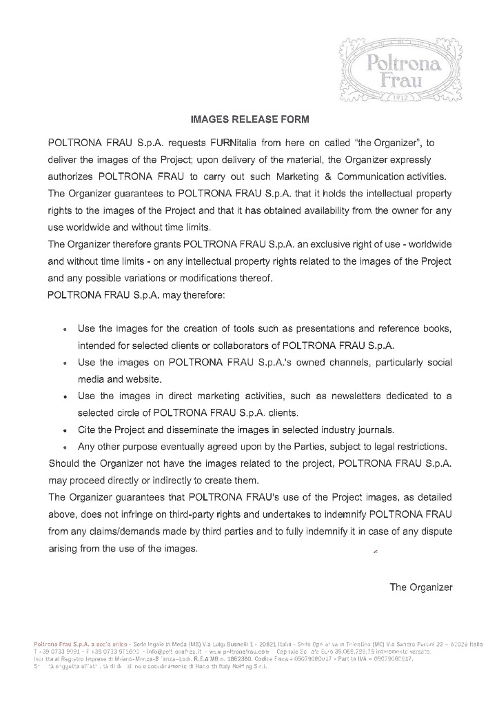 5. By applying to this contest, the participant agrees to give the consensus to Poltrona Frau to collect and use his/her personal information, according to the Poltrona Frau Privacy Policy ( B2B privacy policy)